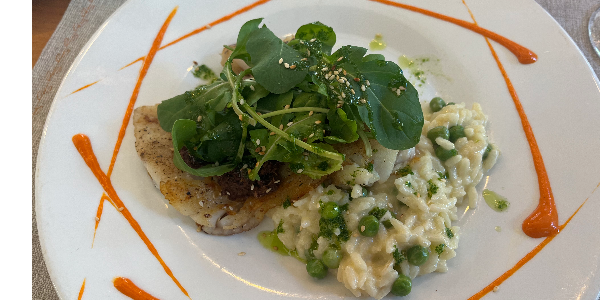 La pesca fresca del día con risotto al Mascarpone, tapenade de de olivas negras, tomate seco y alcaparras. Con rúcula y aceite de oliva.