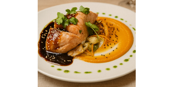 Salmón fresco grillado en su punto, con vegetales frescos al wok, puré de boñatos perfumado con aceite de coco y salsa teriyaki perfumada con genjibre, semillas de sésamo y cilantro. Cocina fusión.